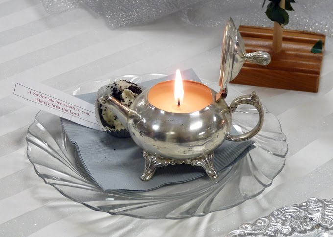 The next few photos are a couple of favorites. I love this table and the centerpiece was so Beautiful!!This table with the white and silver was simply Gorgeous!LOVE these little teapot candles!!This table just makes me smile. It was so pretty and the centerpiece reminds me of the Night before Christmas story--while visions of sugarplums danced in their heads.The centerpiece on this table was so creative! This table was sponsored by a local company that makes soap and the trees were made from soap and then they added the lights!!