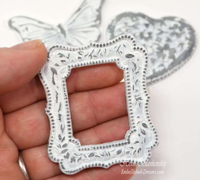 I added metal filigree flowers and a butterfly from ButterBeeScraps to the flower centers and on top of the embossed butterfly.