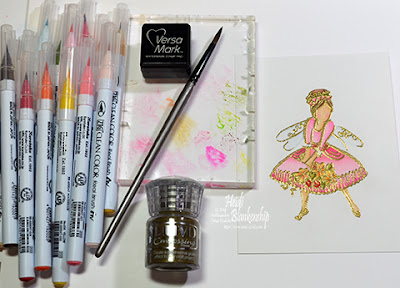 I did a couple layers of the pale colors drying in between the layers and then I added a couple more layers with a bit darker colors. To do this I used the same ink colors and just added less water. Once I was done I made sure the paper was good and dry and then I added water droplets on to the paper. I let them sit for a few seconds and then used a paper towel to blot them off.